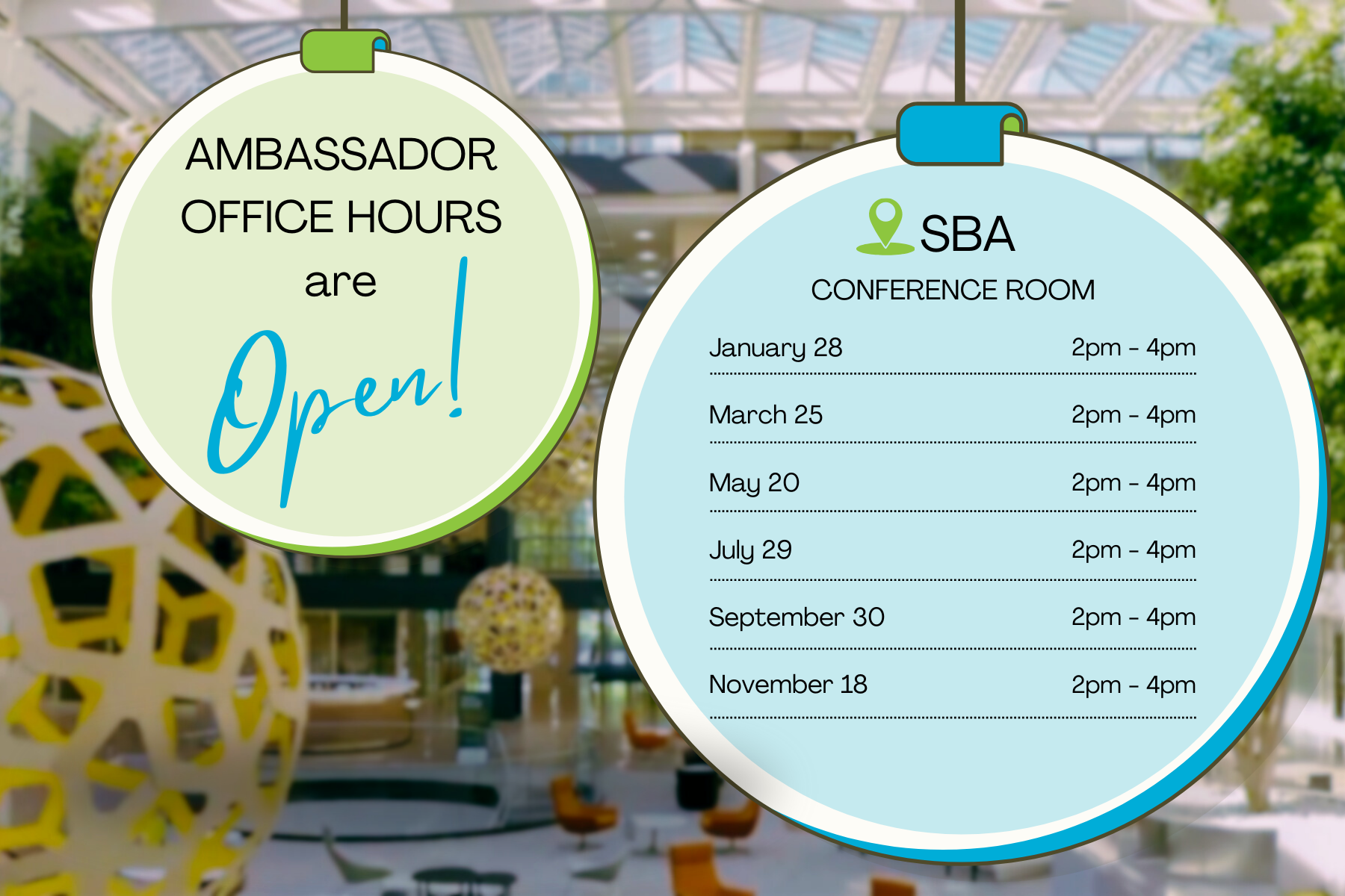 On the last Wednesday of every other month, from 2pm - 4pm, you’re invited to stop by the SBA office for Ambassador Office Hours. A small group of Ambassadors will be on-site, ready to meet with you, answer questions, and help you navigate your membership. You can drop in at any time during the two-hour window, no reservation needed.