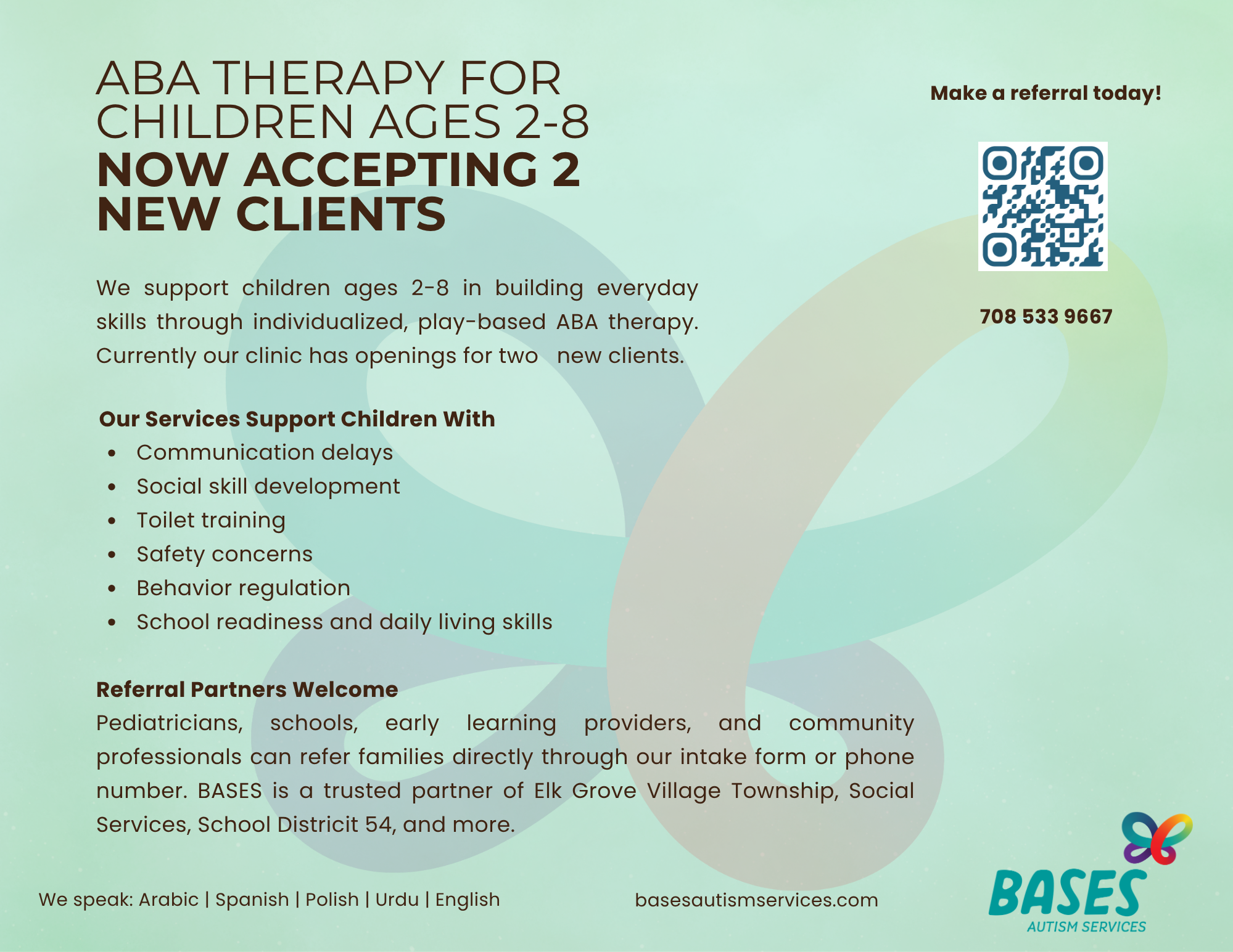 BASES Autism Services is proud to announce we have 2 client openings for children ages 2-8 in need of ABA therapy support.